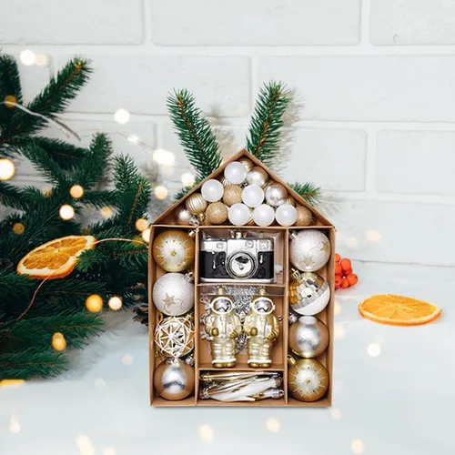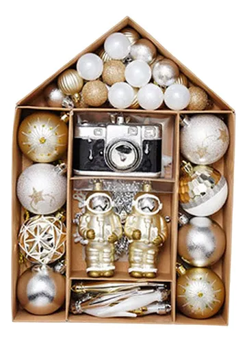 Set de 70 adornos navideños en tonos dorado y plateado. Incluye esferas, figuras decorativas y ornamentos especiales para dar un toque elegante y luminoso a tu árbol.