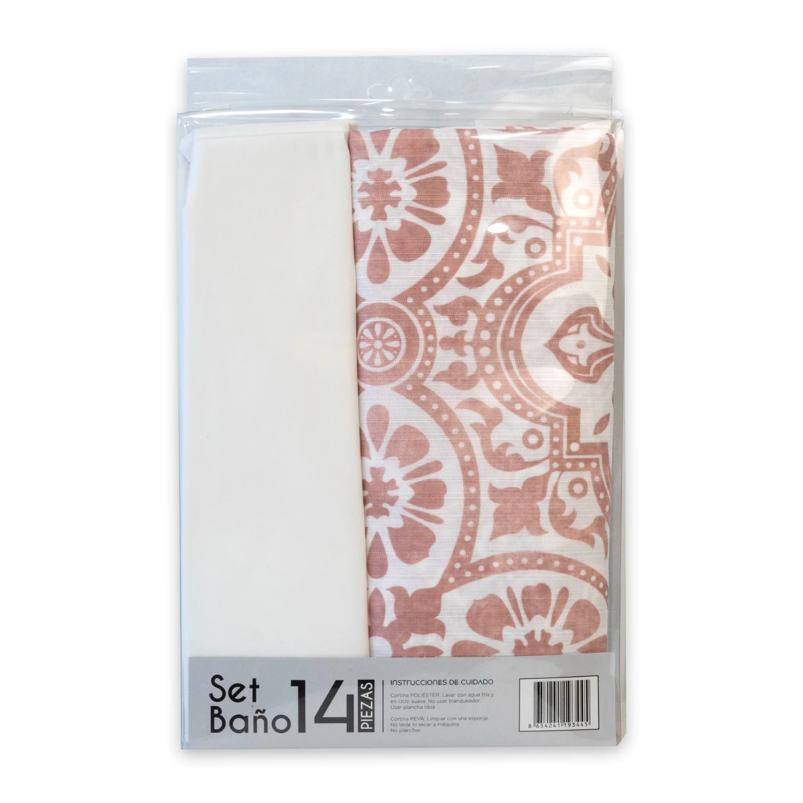 Set de Baño Doral de 14 piezas: incluye cortina 100% poliéster, forro PEVA y 12 ganchos plásticos. Diseño elegante, resistente y de secado rápido. ¡Todo lo que necesitas para renovar tu baño fácilmente!