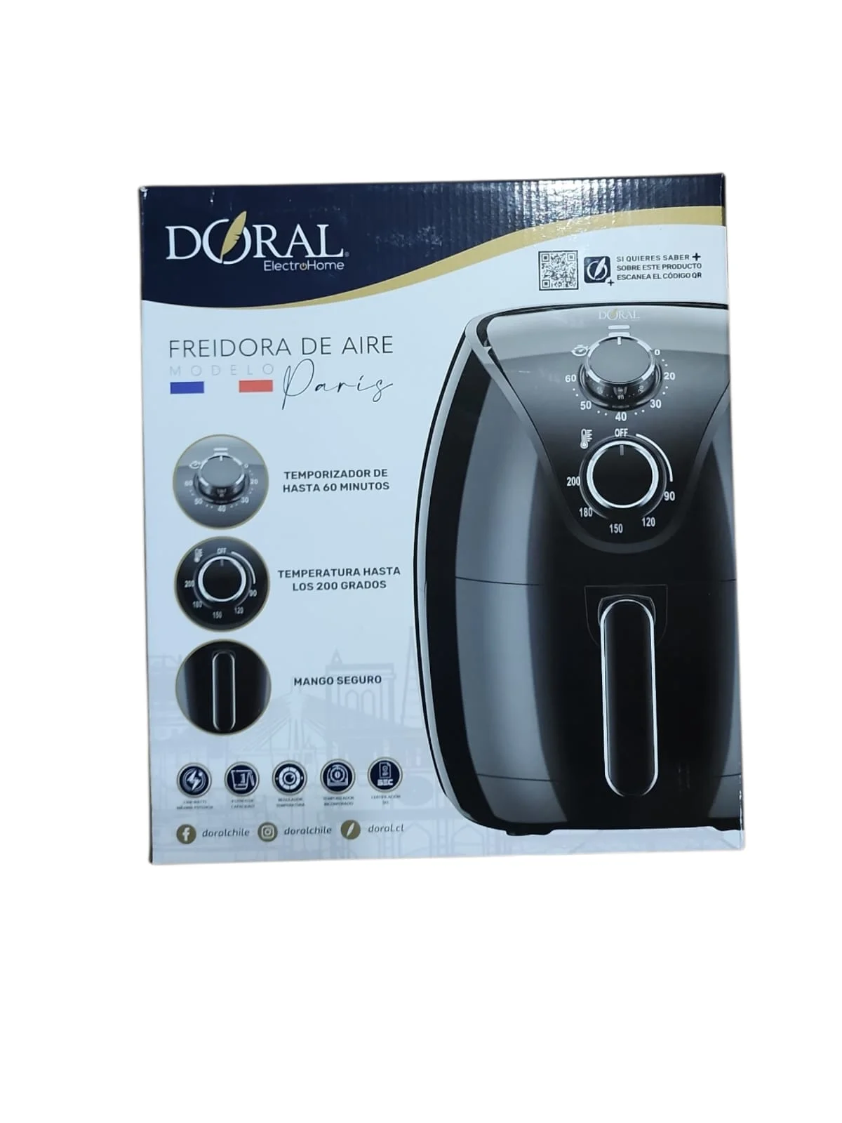 Freidora de Aire Doral Paris con control de temperatura hasta 200°C y temporizador de 60 minutos. Cocina sin aceite, fácil de usar y limpiar. Perfecta para comidas rápidas y saludables.