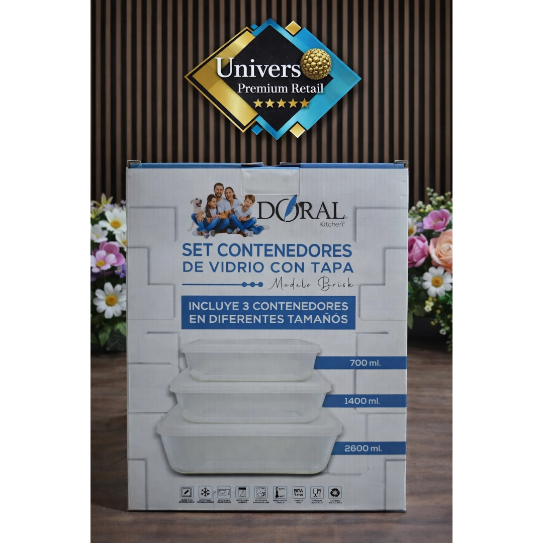 Set de 3 contenedores de vidrio Doral Kitchen con tapa hermética, ideales para conservar alimentos. Incluye capacidades de 700 ml, 1400 ml y 2600 ml. Aptos para microondas, refrigeración y congelación. Libres de BPA y seguros para el uso diario.